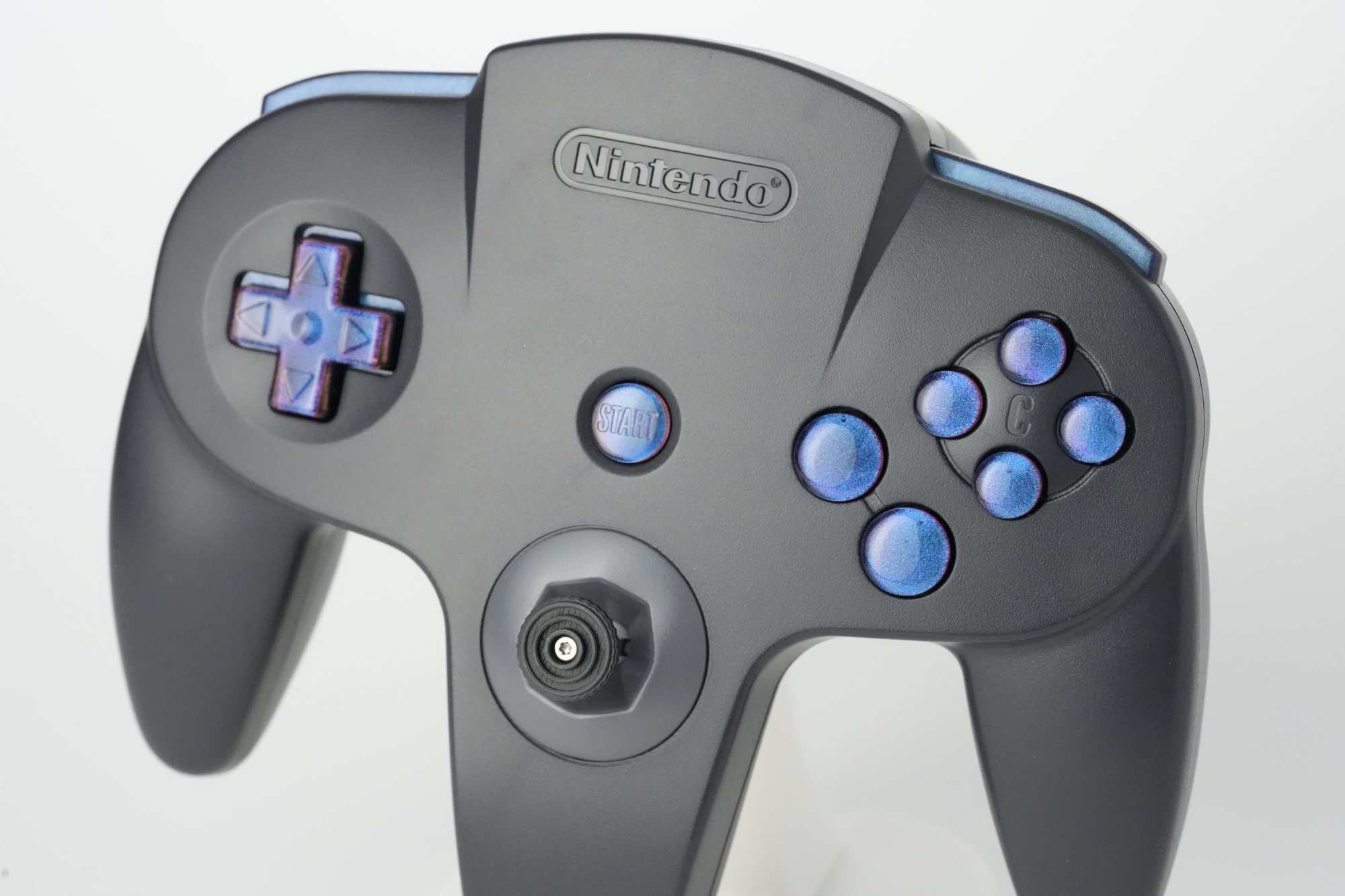 Infuse your N64 controller with a celestial glow using these custom-cast resin buttons featuring Oracle, a high-intensity pearl pigment that radiates a dynamic spectrum of blue, purple, red, and gold hues. The color-shifting effect ensures a mesmerizing display that changes with every movement.